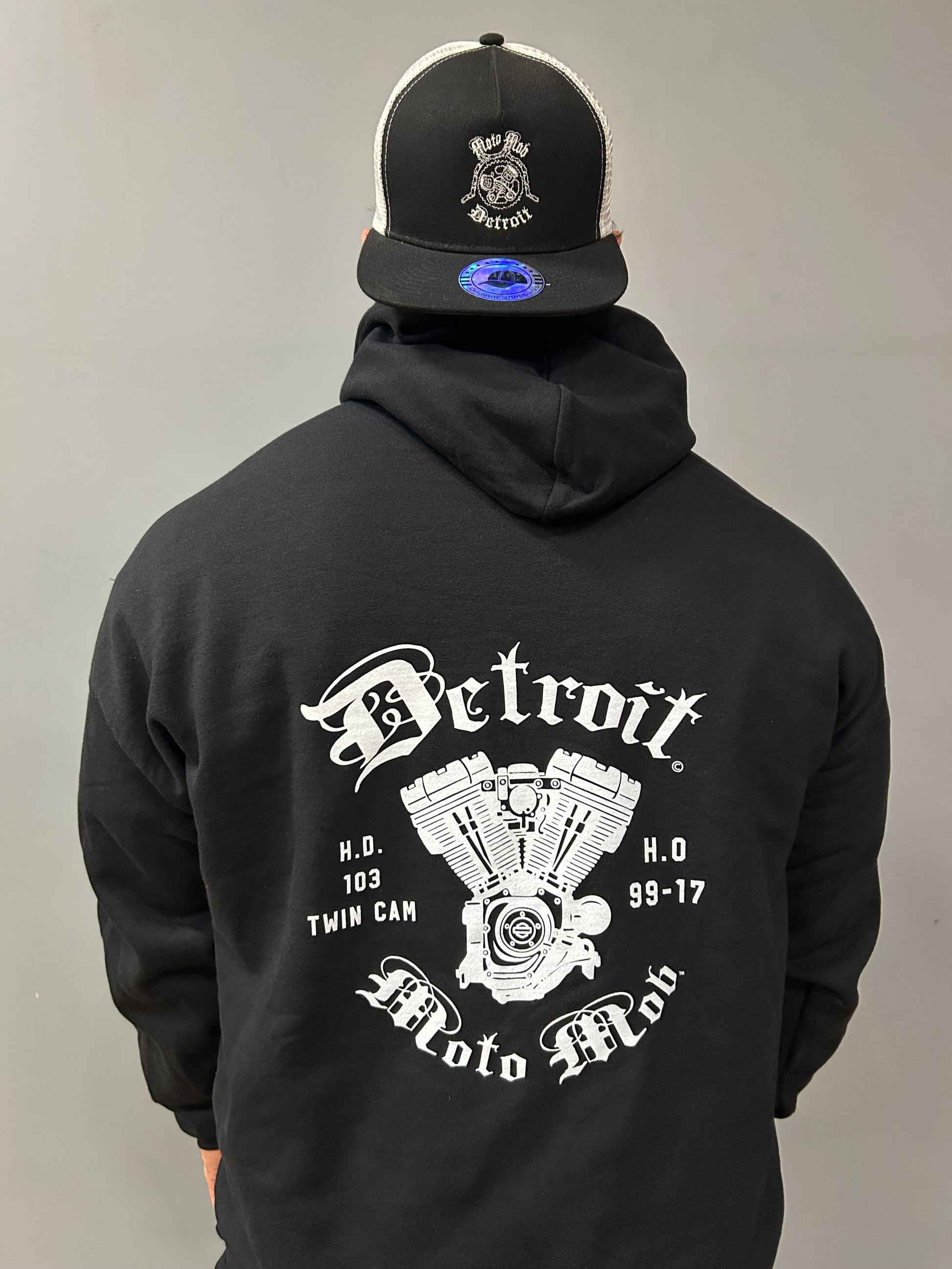Detroit Moto Mob motorcycle enthusiast of the 103 High Output H.D. motor. Printed with years made between 99-17 on a full back, big print.