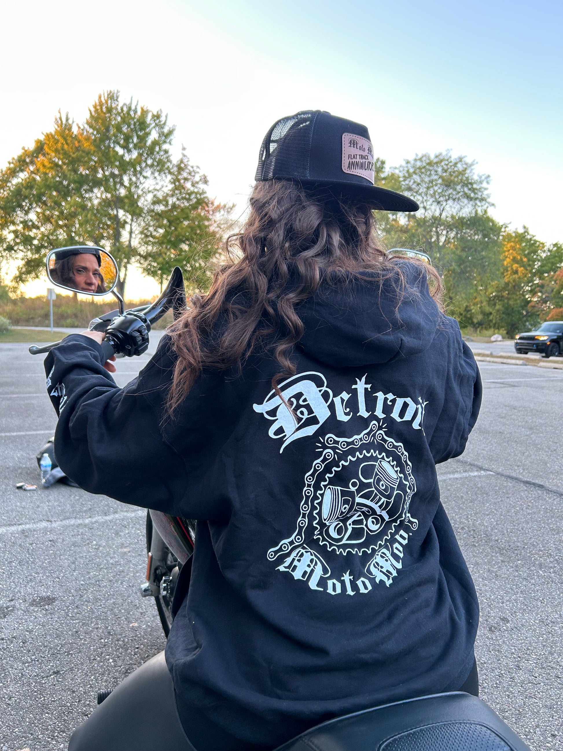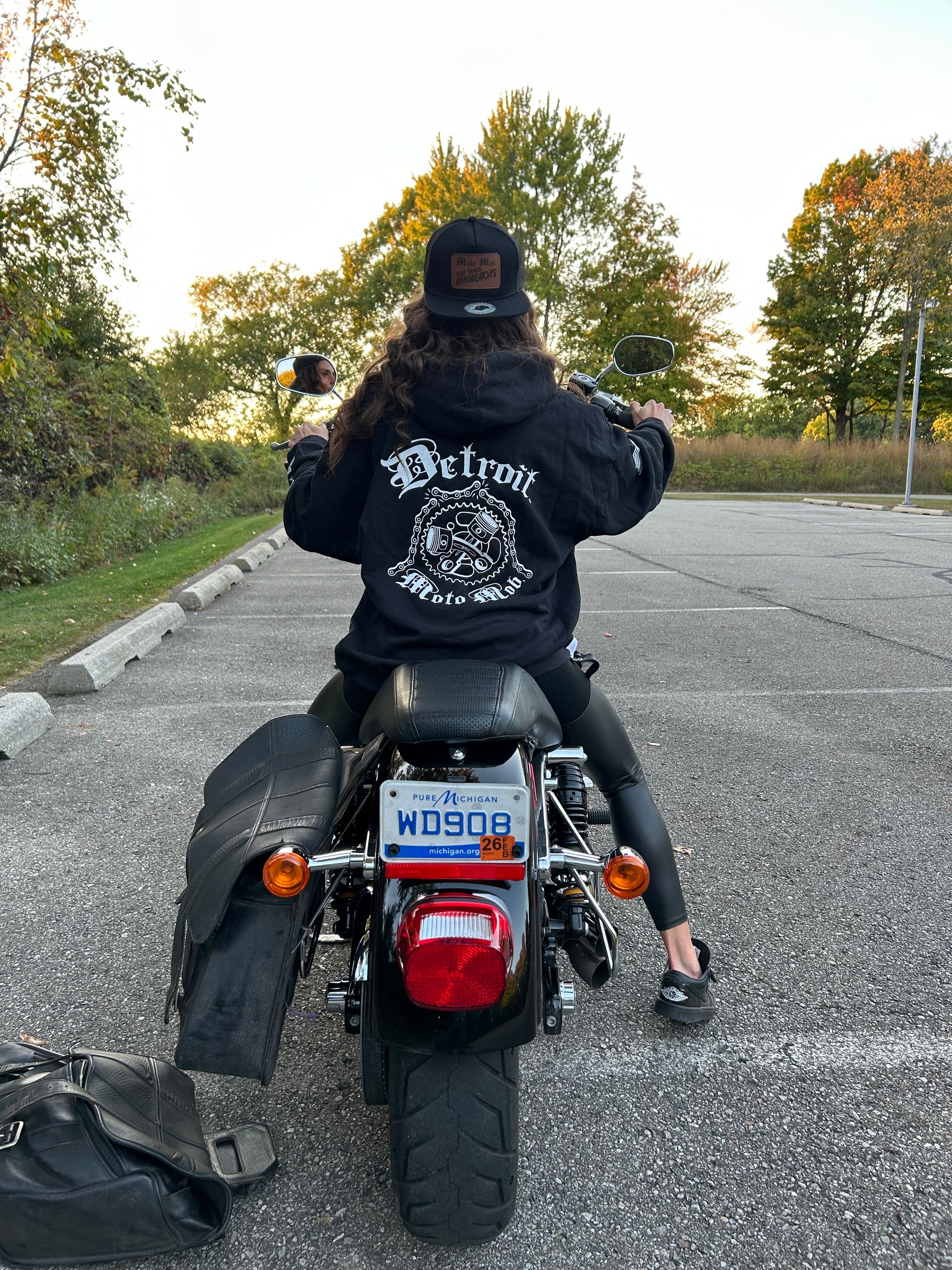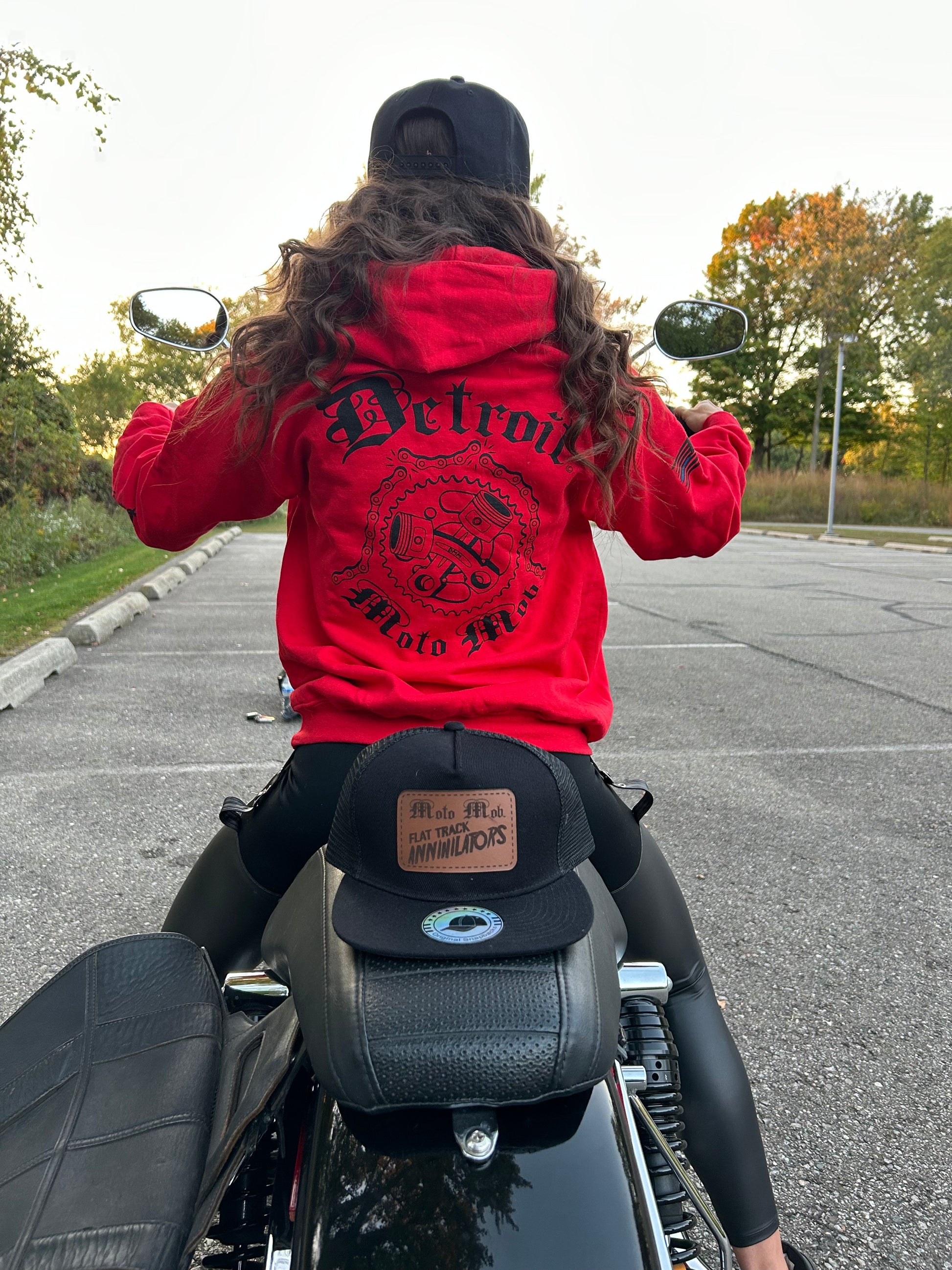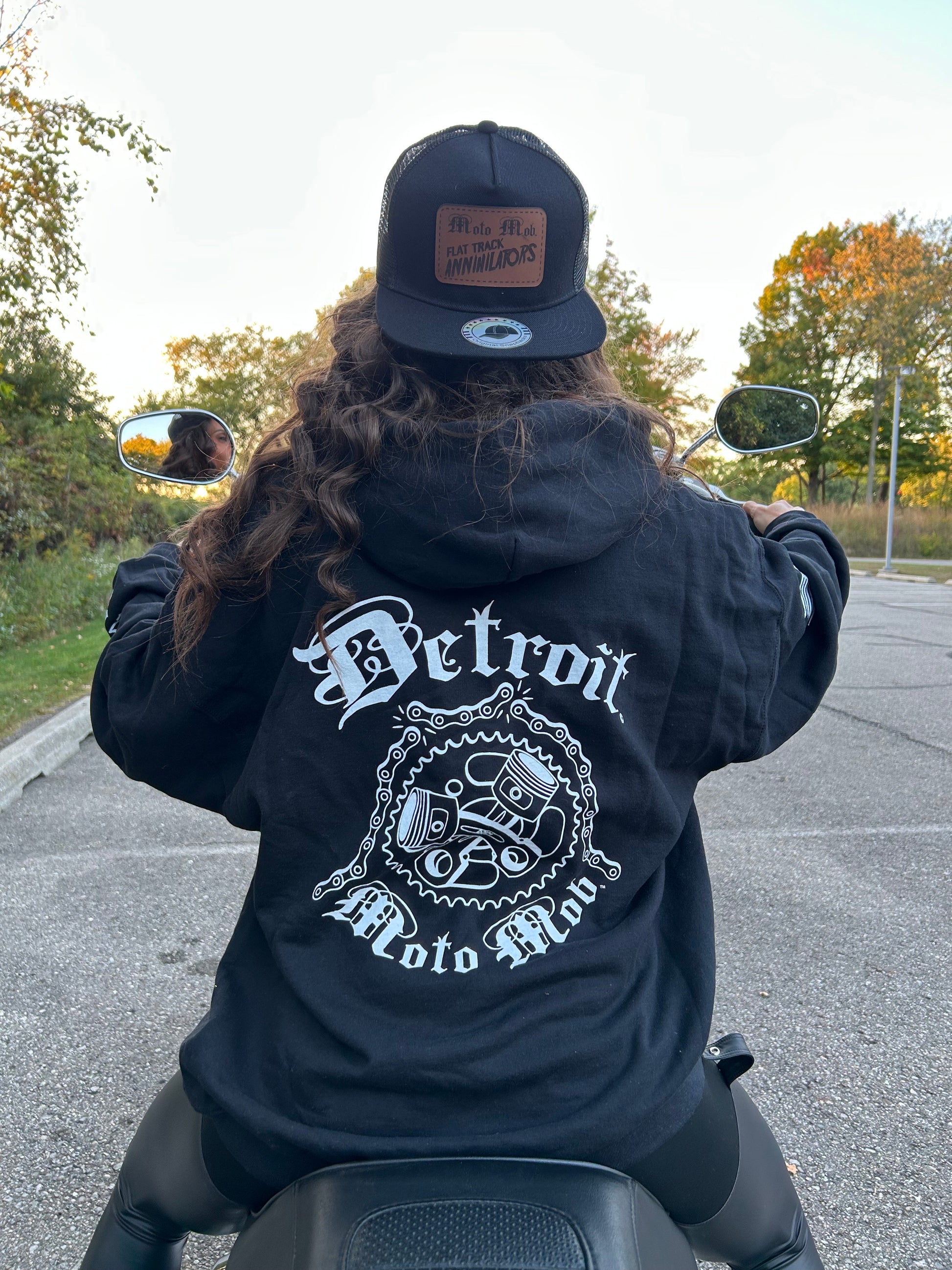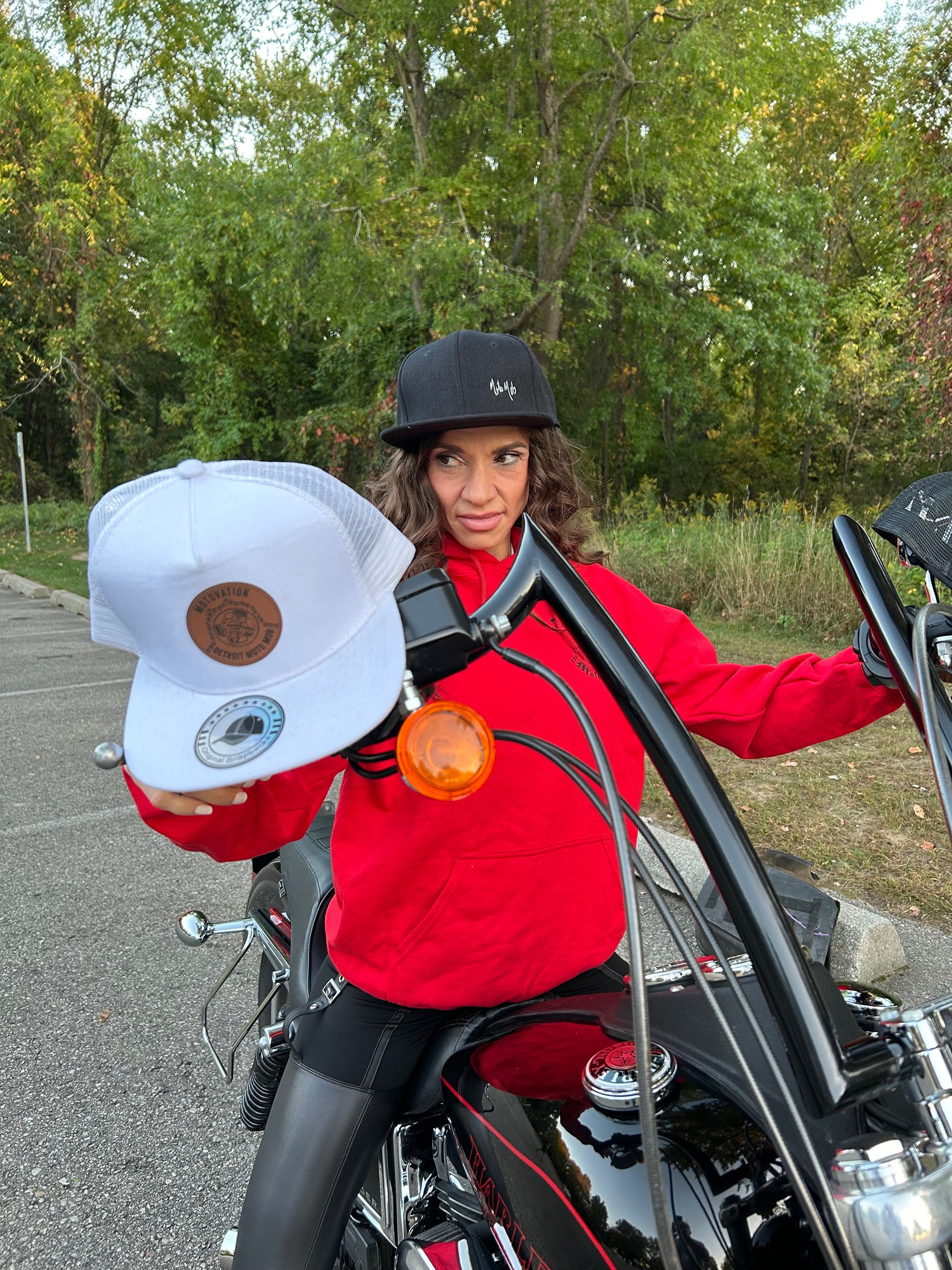 This all-black trucker hat from Detroit Moto Mob features a bold Moto Vation leather patch, combining rugged style with street-ready attitude. Its snap back design ensures a perfect fit, making it the ultimate accessory for those who live life on the edge. Durable and distinctive, this cap adds a fierce finishing touch to any outfit.